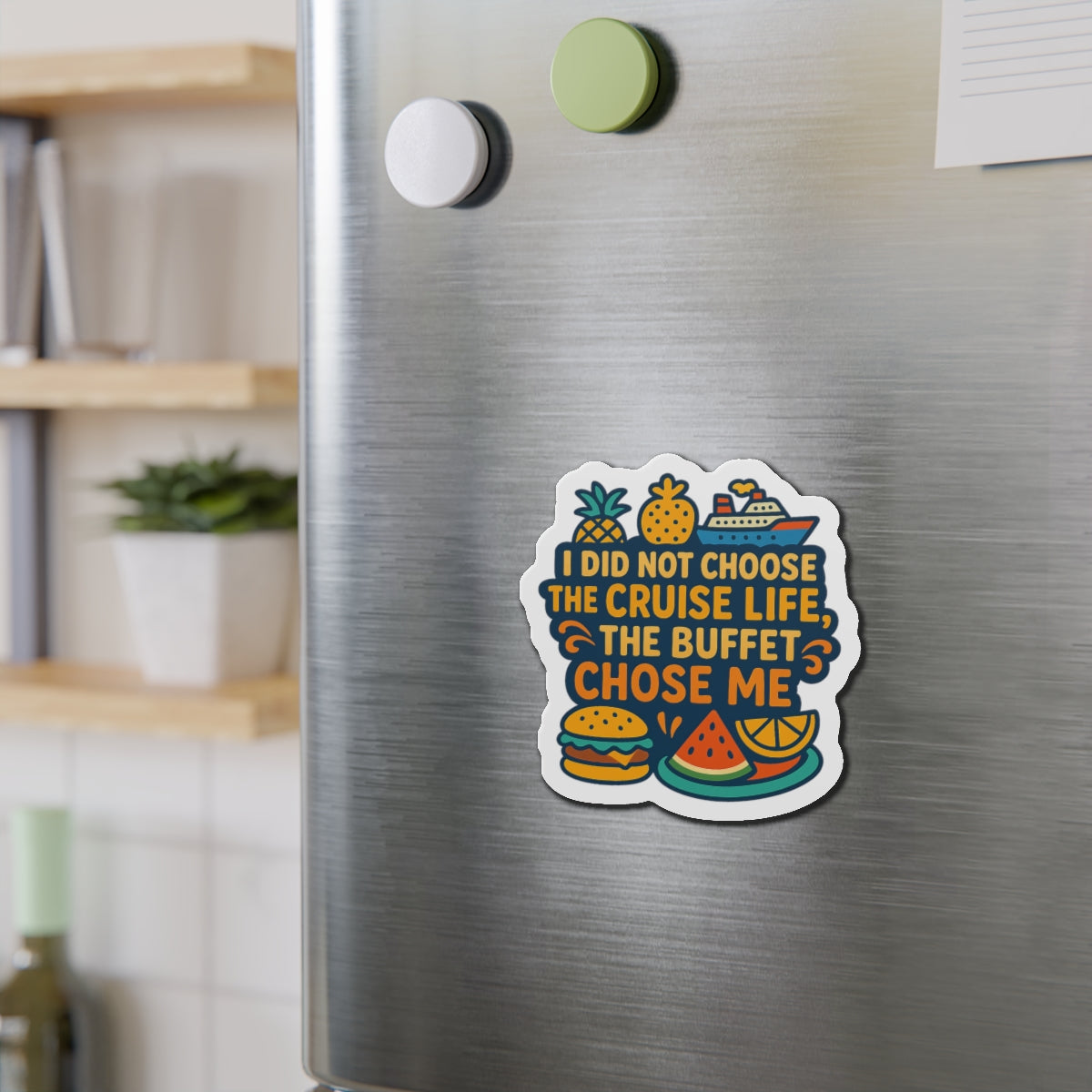 Declare your cruise philosophy with the 'Buffet Chose Me' cruise door magnet! This bold and colorful die-cut magnet features elegant script and a warm retro palette, making your stateroom door easy to spot and a guaranteed conversation starter. Crafted with durable materials, it's designed to withstand the unique conditions of a cruise ship while adding a touch of personality to your voyage. Celebrate the lighter side of cruise life and create lasting memories with this hilarious and charming magnet, a perfect way to personalize your floating home away from home.