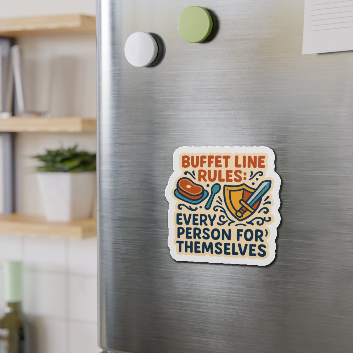 Navigate the high seas and the sometimes-treacherous buffet lines with our 'Buffet Line Warfare' stateroom door magnet! This bold and colorful die-cut magnet, featuring elegant script and a warm retro palette, is the perfect way to add personality and humor to your cruise cabin. Not only will it make your door easy to spot among a sea of identical hallways, but its durable, ship-ready design ensures it withstands ocean breezes and bustling corridors. Spark laughter and camaraderie with fellow cruisers as you declare your buffet battle strategy, creating unforgettable memories on your next maritime adventure.