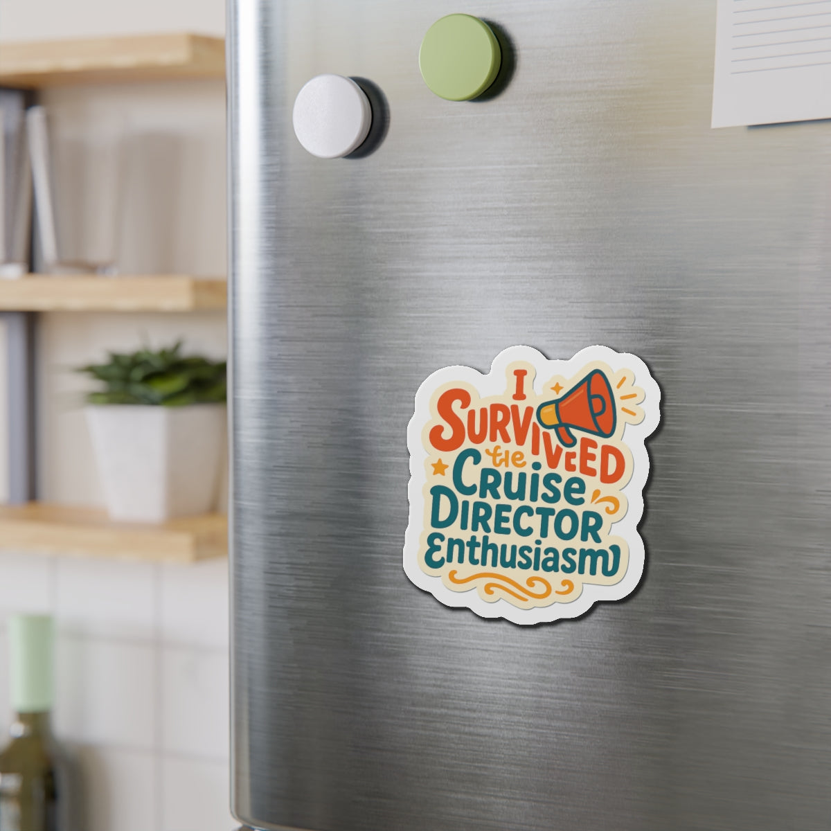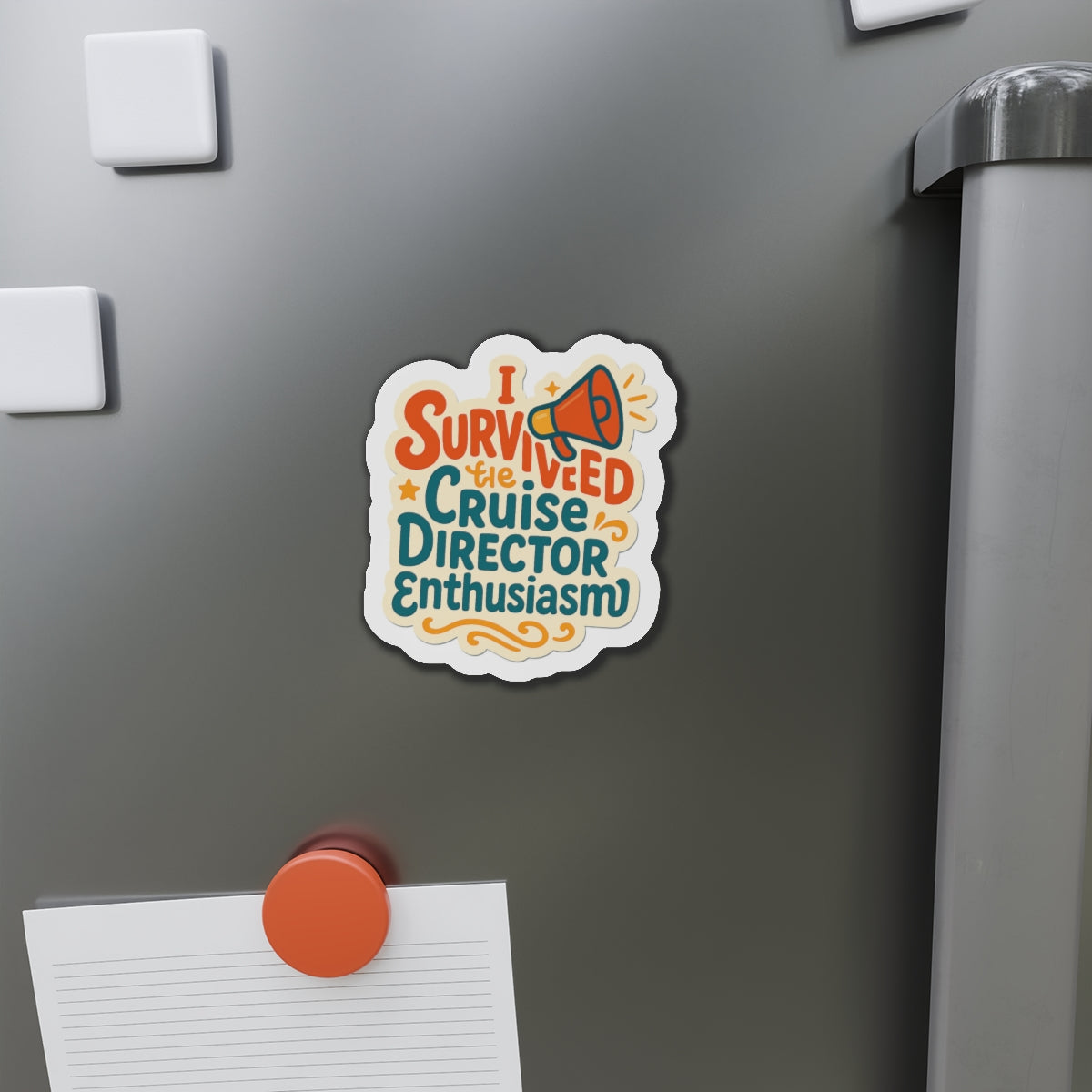 Make your stateroom door a conversation starter with the 'Enthusiasm Survivor' cruise door magnet! This bold and colorful die-cut magnet features elegant script text that reads 'I survived the cruise director enthusiasm,' decorated with a megaphone and stars in a warm retro color palette. Not only will it help you easily spot your room among a sea of doors, but its durable, high-quality material is designed to withstand the unique conditions of a cruise ship. Celebrate those unforgettable cruise memories and share a laugh with fellow travelers every time you return to your cabin.