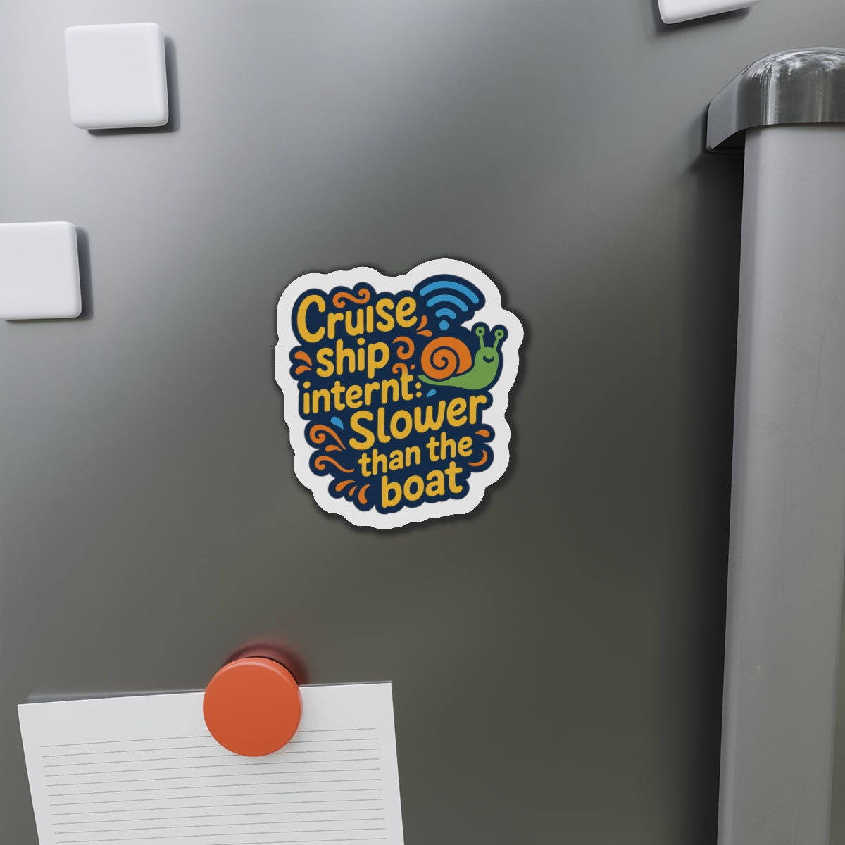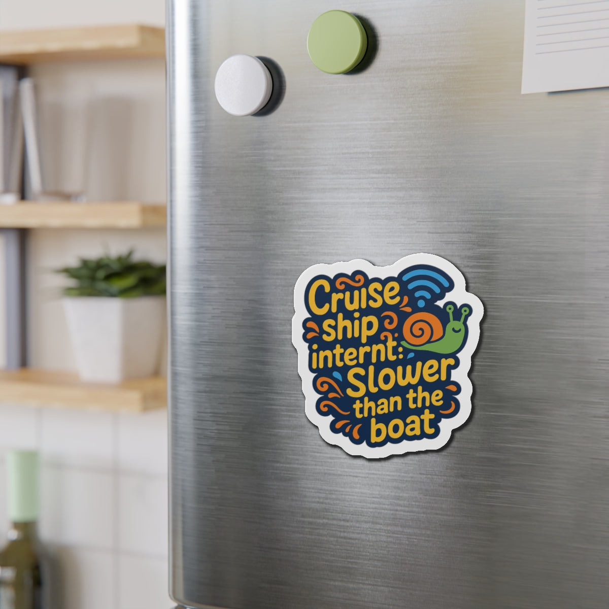 Navigate the high seas with a touch of humor and make your stateroom door unforgettable with the 'Slower Than Boat Internet' magnet! This bold and colorful die-cut magnet features elegant script and a witty nod to cruise ship internet speeds, artfully blending retro charm with a modern chuckle. Crafted for durability, it's designed to withstand the unique environment of a cruise ship, making your door easy to spot and a guaranteed conversation starter. Infuse your cruise with personality and create vibrant memories before you even step inside your cabin!