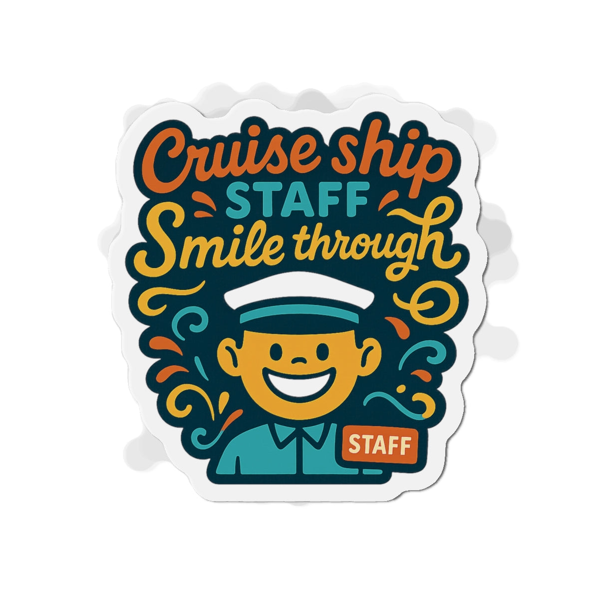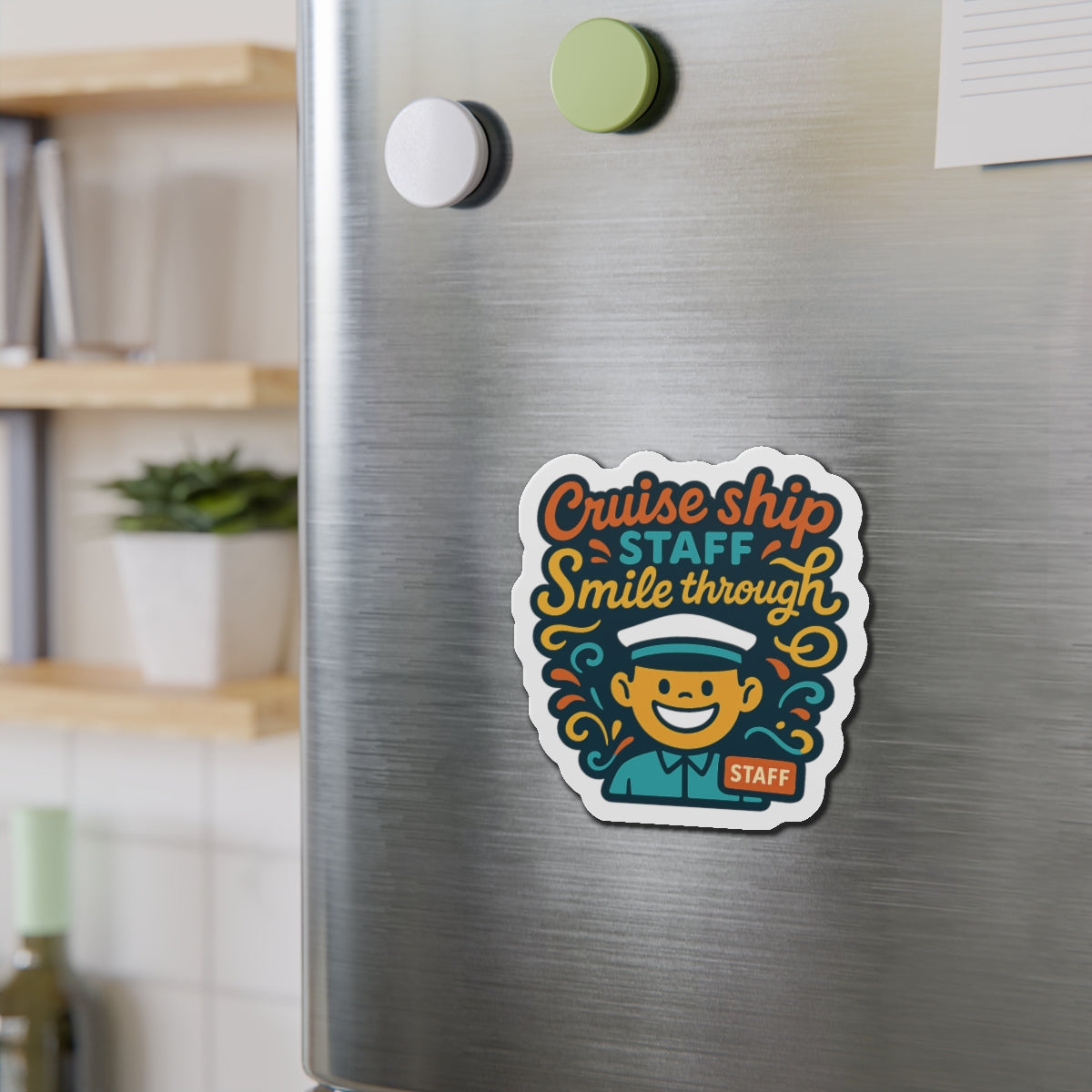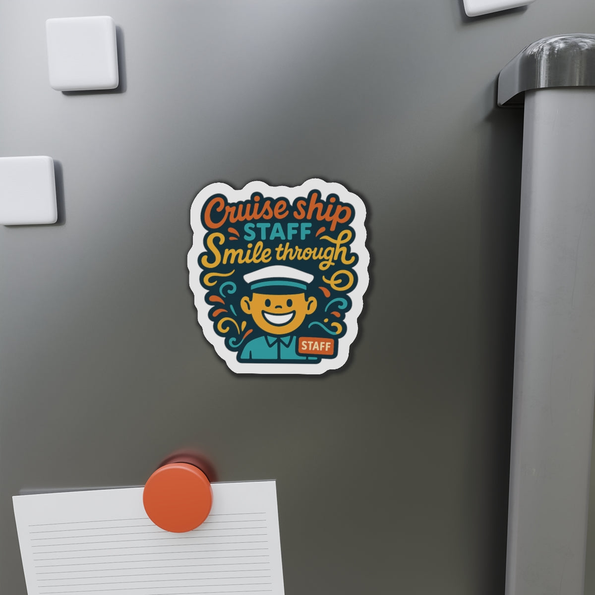 Transform your stateroom door into a reflection of your sunny cruise spirit with our "Smile Through Anything" door magnet! This bold and colorful die-cut magnet features elegant script reading 'Cruise ship staff: Smile through anything' with charming decorative flourishes, set against a warm, retro palette with playful name tag and big smile elements. Crafted to withstand the unique environment of a cruise ship, this durable magnet helps your stateroom stand out while adding a touch of personalized whimsy to your voyage. It's the perfect way to share good vibes and make lasting memories on the high seas!