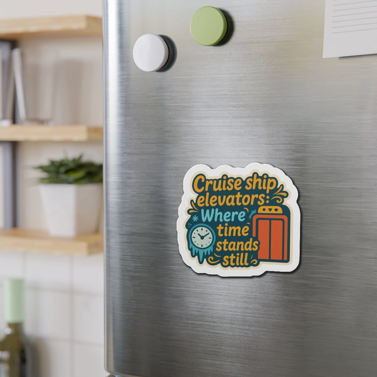 Add a touch of humor and personality to your cruise stateroom door with the "Time Stands Still Elevators" door magnet! This bold and colorful die-cut magnet features elegant script text: 'Cruise ship elevators: Where time stands still,' bringing a smile to everyone's face. Crafted for durability, it withstands the sea environment, ensuring your stateroom stands out voyage after voyage. It's the perfect way to easily spot your cabin, spark conversations, and create lasting memories on your next adventure at sea.
