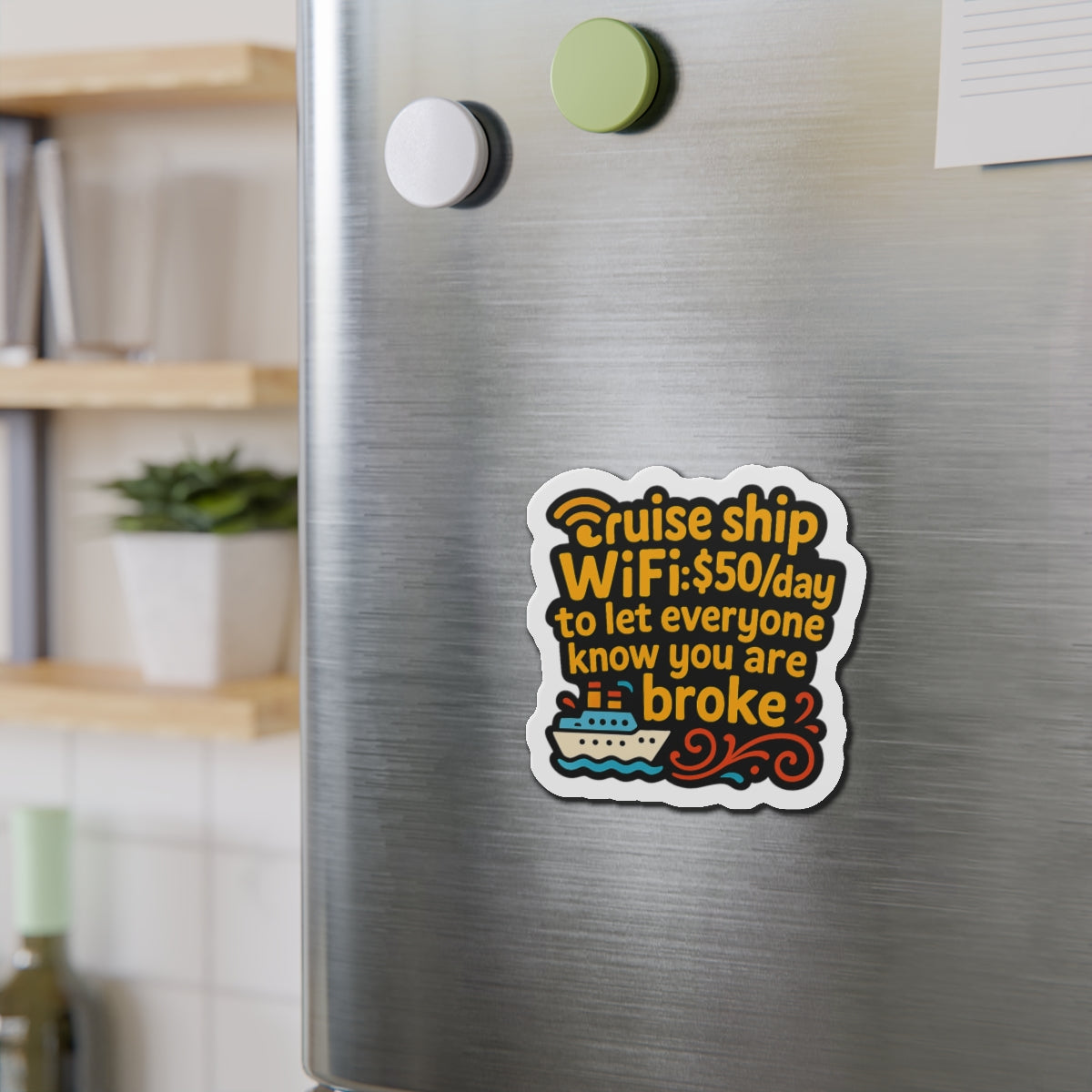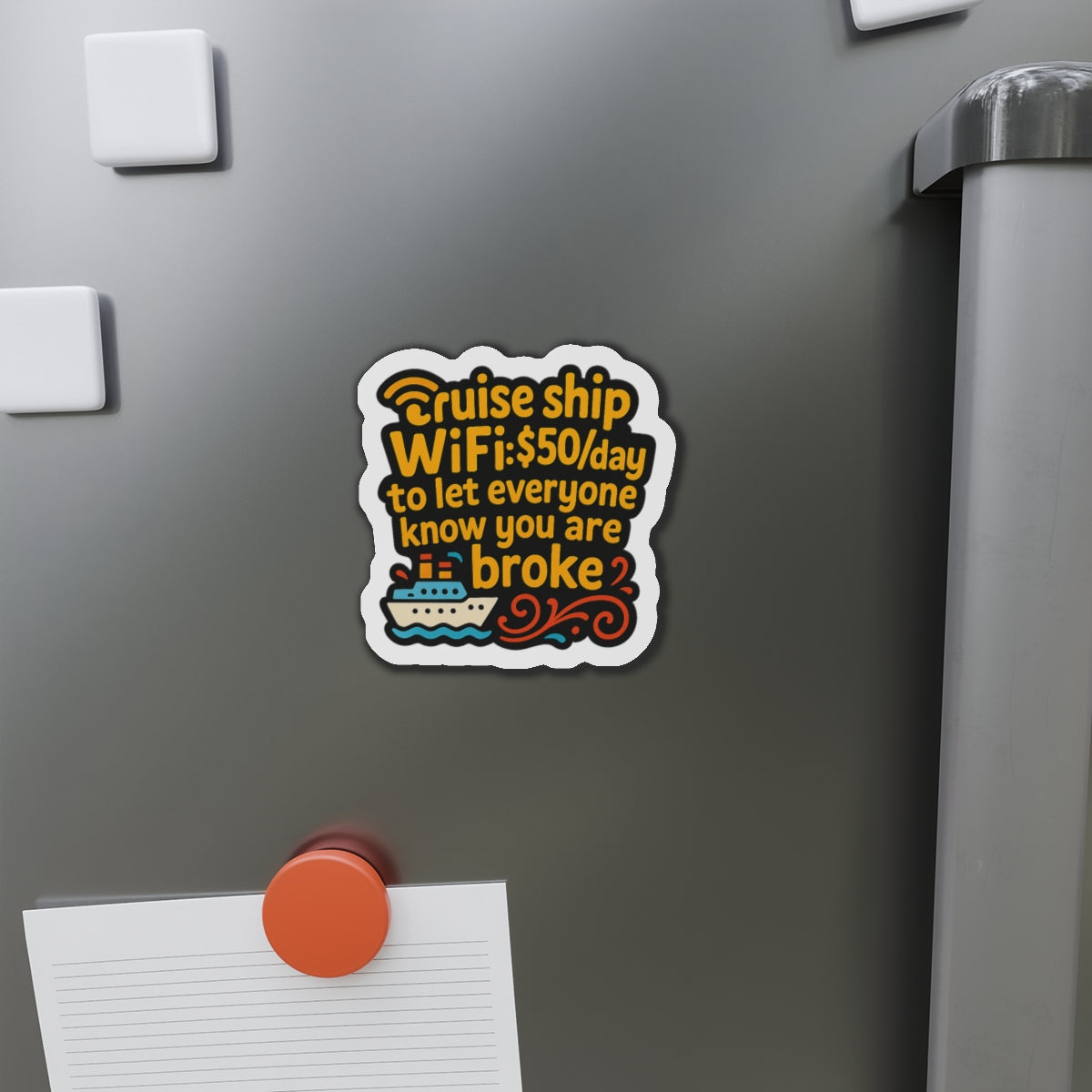 Make your stateroom door unforgettable with the "WiFi Highway Robbery" magnet! This bold and colorful die-cut magnet, featuring elegant script, is a hilarious nod to a common cruise experience, ensuring your door stands out in a sea of sameness. Crafted for marine environments, it's durable and strong enough to stay put through all your sea day adventures. Not just a decoration, it's a conversation starter and a guaranteed smile-inducer for fellow cruisers, adding a touch of humor to your vacation memories.
